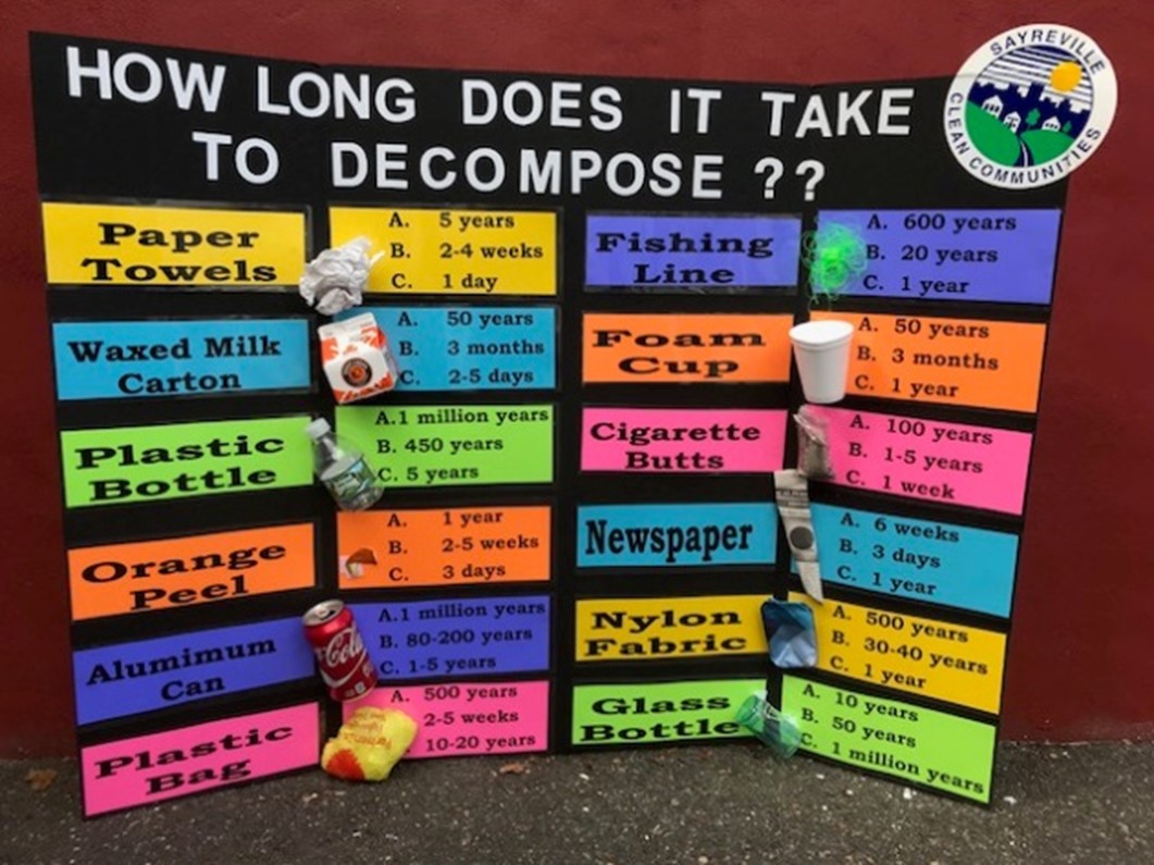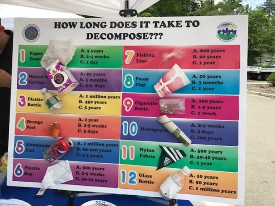 Make your own game! Bergen County made a game based upon how long it takes various items to decompose in the environment. Sayreville followed with their version. It’s a great way to interact with residents at public events.