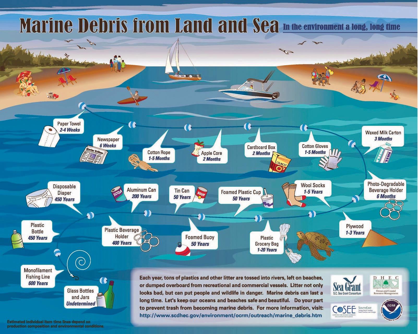 See the info graphic “Marine Debris from Land and Sea” (shown below) for information on decomposition times. Also, this PDF file contains a list of decomposition times.